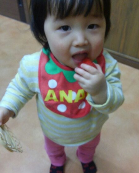 苺のスタイをつけて苺を食べる姪っ子(笑)春ですね~